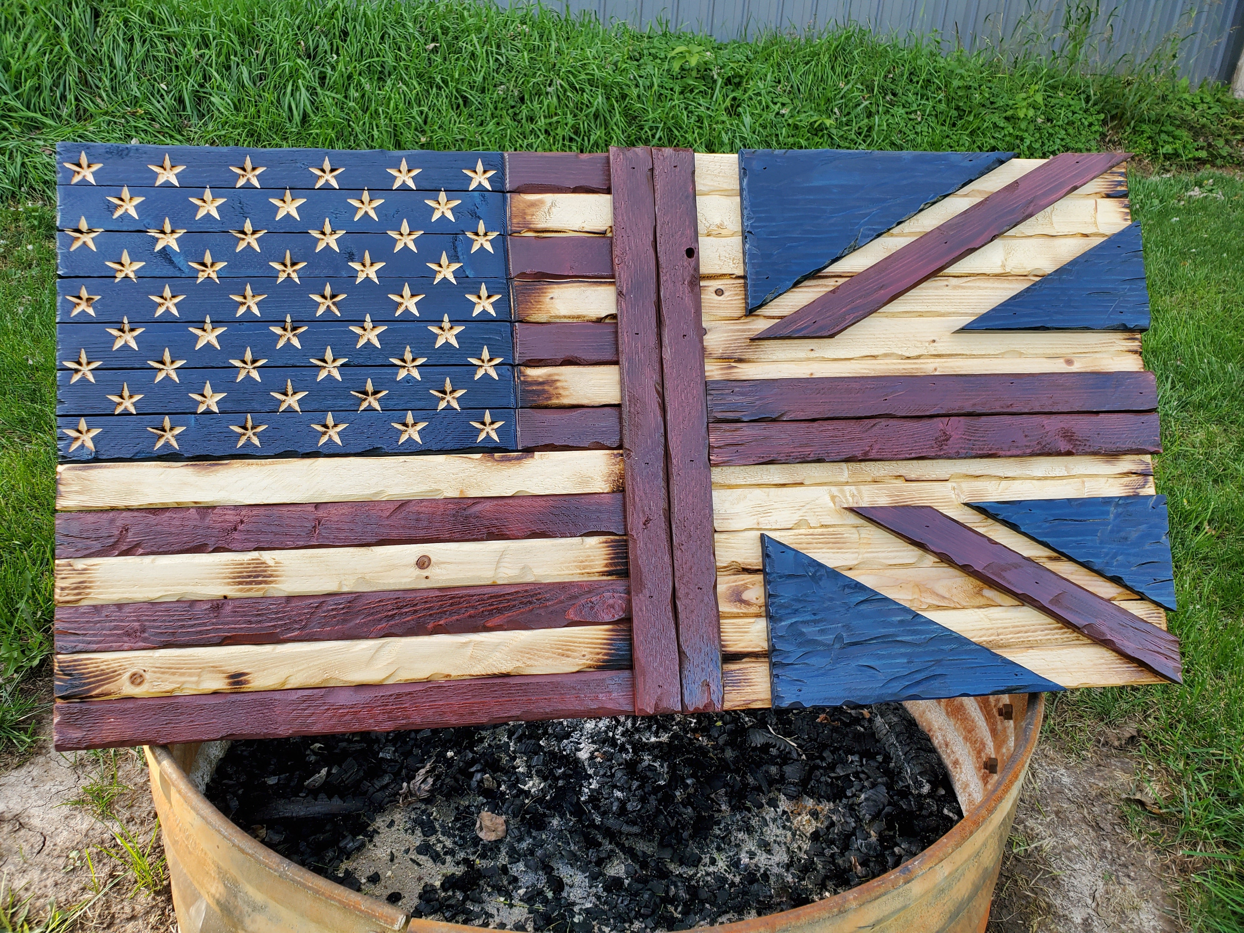 Are you looking for a one of a kind flag that is handmade and not mass produced? This is the flag for you! The multi day process we use to make your flag begins with hand shaping every stripe. After that, each stripe is then sanded and once up to our quality standards we send it over to get charred with our unique charring process. Each union is hand shaped then we use a special process to raise the grain before we char it. Both the union and red stripes use a color blend stain we created only for our flags. All our unions are carved on our CNC then touched up with a chisel if needed. After all that work, your flag is sent to the assembly room to be built were we use quality glue and approximately 130 stables, This will ensure your flag will last for a very long time. Each flag will be sealed with a quality polyurethane and two D rings installed to ensure easy hanging.
